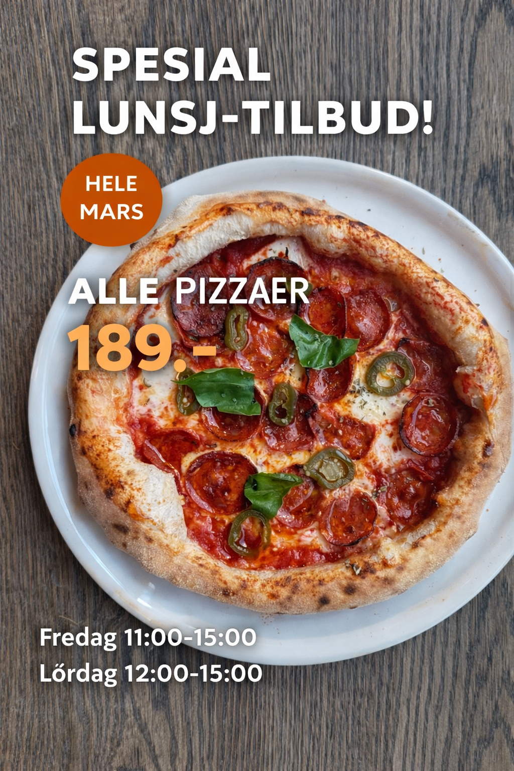 🍷 Spør din servitør om glutenfri bunn (+35 NOK), ekstra topping eller vinanbefalinger.